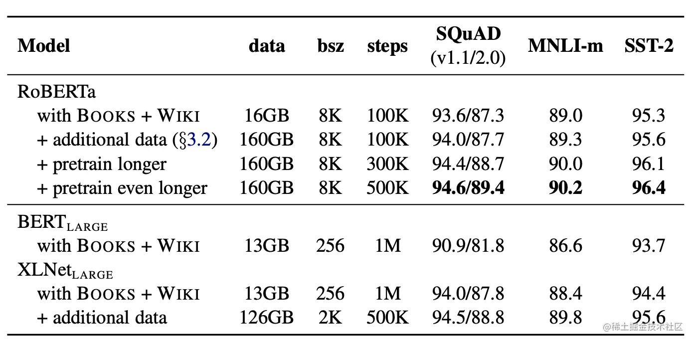 进一步佩服作者的耐心,这里作者清洗了160G的训练样本vs BERT(13G) vs XLNET(126G)。在BERT已经使用的BookCorpus和Wiki的基础上,加入了新闻CC-News,网页文本OpenWebTet,以及故事类文本Stories。