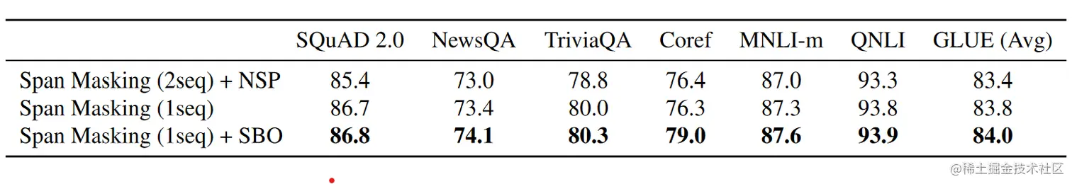 SpanBERT顺带着也对训练策略做了探索,和RoBERTa比较相似。主要是两点优化