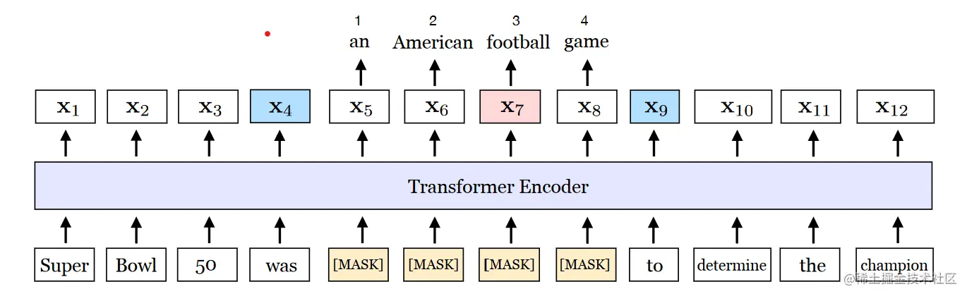 其中是两层激活函数为Gelu的全连接层,并且加入了LayerNorm。预测的输入是Span的左右边界token,以及span内部的相对位置编码。SBO的核心是在更新全局信息的同时,span边界的token进行额外的更新,帮助他们学习和Span内部的语义交互,感觉会让每个token有机会学到更加丰富的语义表达,避免在全局交互时每个token学到的信息被稀释。整体损失是MLM和SBO的损失之和,对应上图football的损失函数为