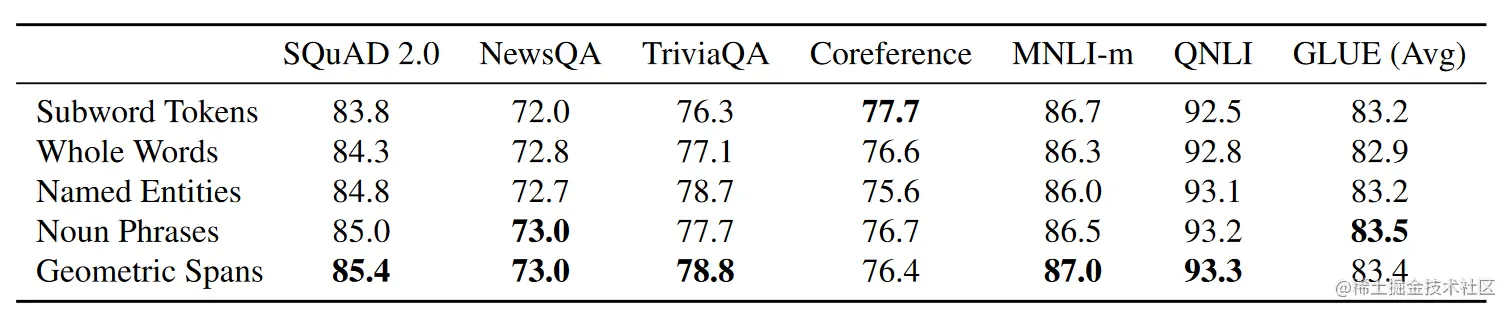 以下Whole Word Masking和knowledge Masking,其实都是Span Masking的一种特殊形式,只不过前两者强调MASK必须针对完整的词或者短语/实体,而Span Mask其实证明了随机连续掩码的效果更好。作者还通过更严谨的消融进行了验证,作者在原始Bert的预训练策略上,只改变MASK方式,对比whole word,entity,名词的掩码,整体上还是随机长度连续掩码的效果最好~~