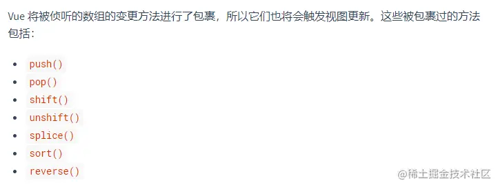 那Vue是如何实现让这些数组方法实现元素的实时更新的呢,下面是Vue中对这些方法的封装: