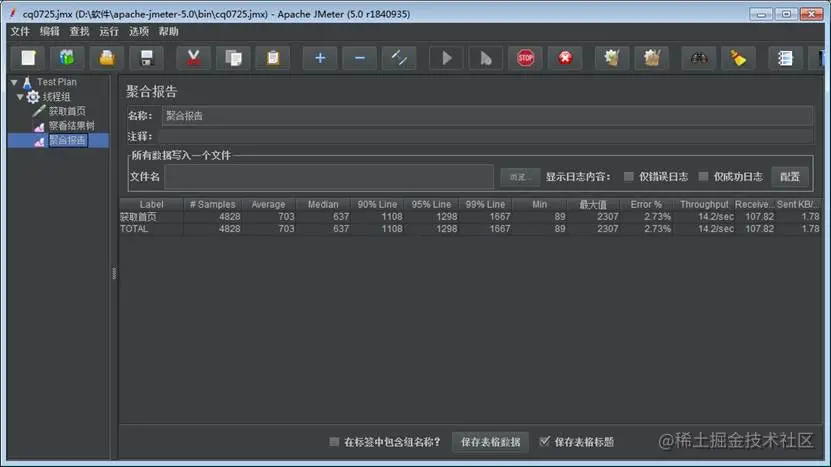 聚合报告中,可以看到当前线程组执行的汇总情况