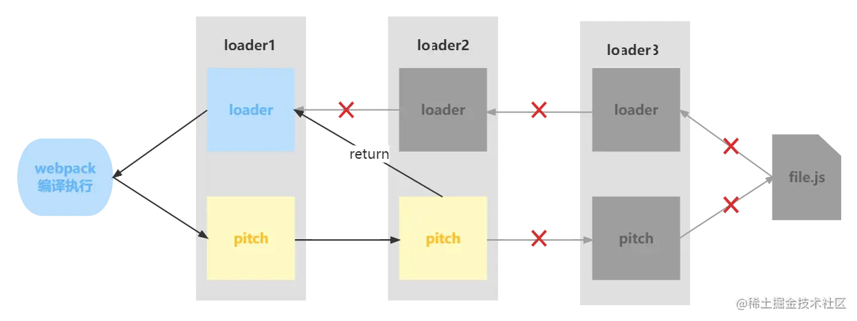 在这个过程中如果任何 pitch 有返回值,则 loader 链被阻断。webpack 会跳过后面所有的的 pitch 和 loader,直接进入上一个 loader 。