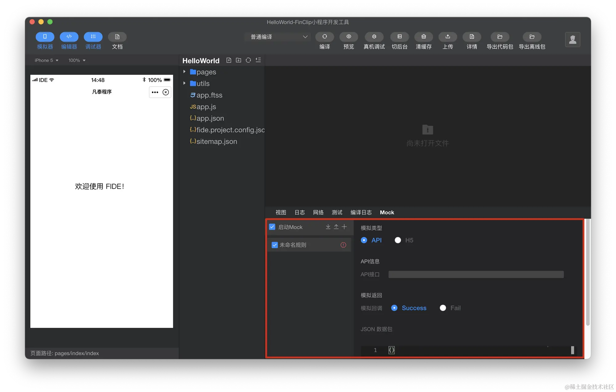 支持 MockApi 主要是针对小程序的接口提供 SDK 模拟调试的功能,例如:用户注册了一个支付的自定义接口,设置好模拟的返回值就可以在 FIDE 里面调试走通逻辑了。同时 Finclip 的 MockAPI 已具备需要导入导出功能,当开发人员与项目中其他成员共享规则时,在模拟中导出规则可以配置,再配置文件发送给其他成员导入导入把。