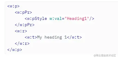 一旦在 Word 文档里有文本定义了额外的样式后,我们将在段落属性标记 <w:pPr> 中找到对该样式的引用。 下面是一个示例,其中我使用样式标题 1 定义了我的文本: