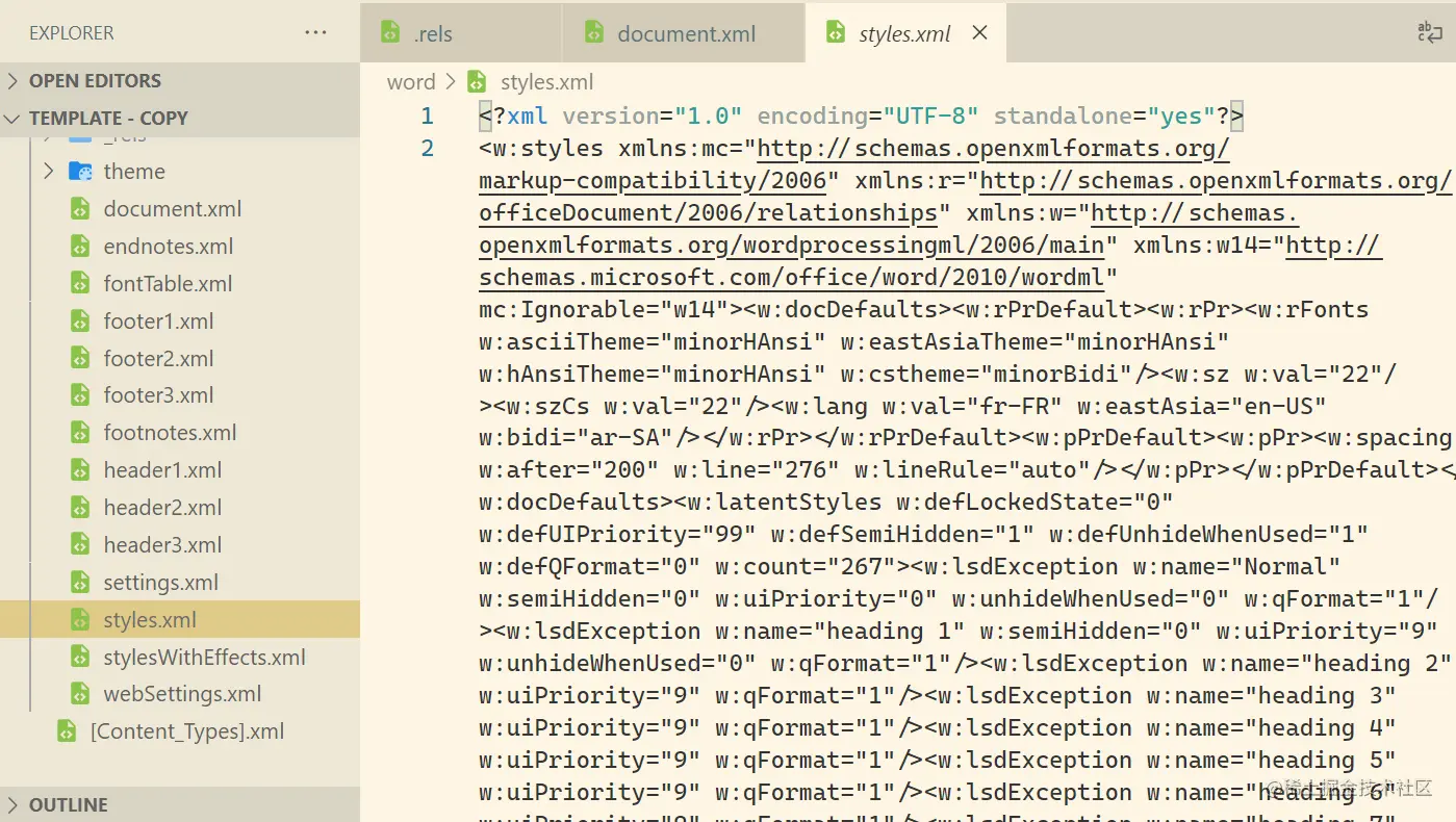 Microsoft Word 中有一个专门用于样式的完整工具栏:正常、无间距、标题 1、标题 2、标题等。 这些样式存储在 /word/styles.xml 中,一个例子如下: