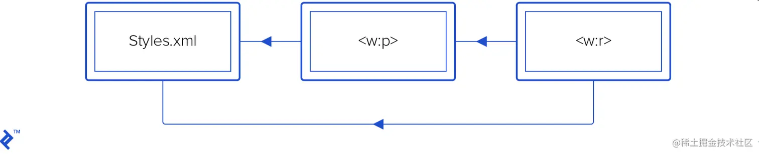 文本属性是可以继承的。 运行有自己的属性(w:p/w:r/w:rPr/*),但它也继承了段落的属性(w:r/w:pPr/*),并且两者都可以从文件 /word/styles.xml 引用样式属性。