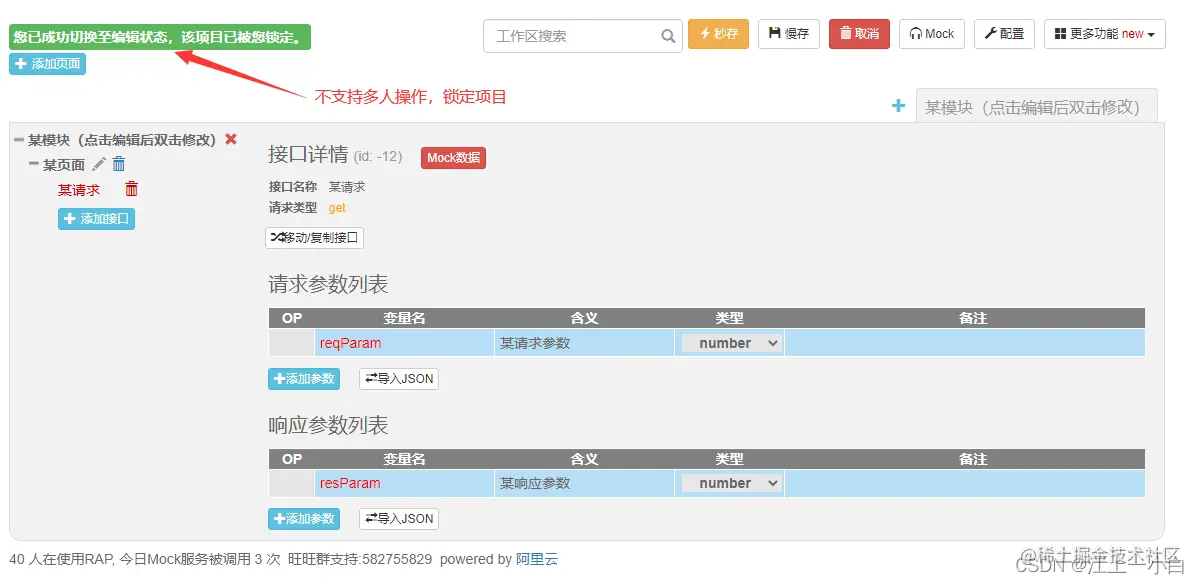 - 支持多人协同工作,对同一项目接口进行管理、编辑(内部加锁,页面操作无感)