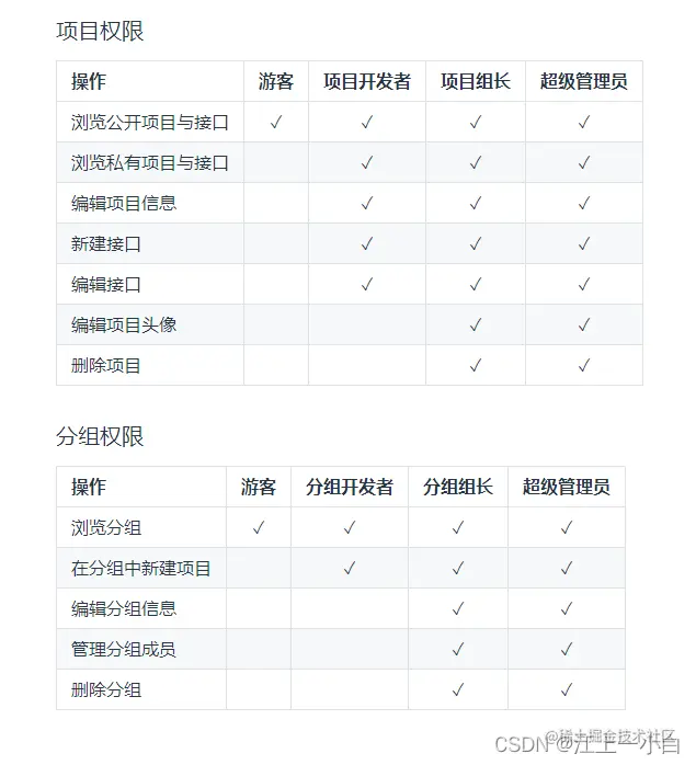 | 浏览公开项目和接口 | √ | √ | √ | √ |