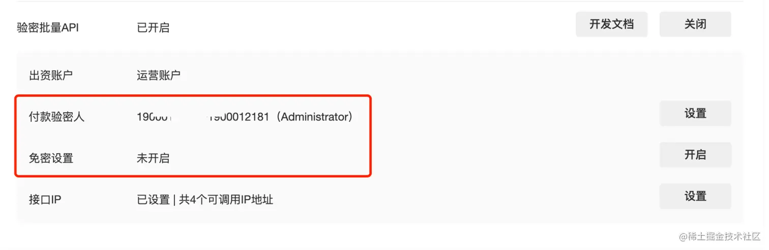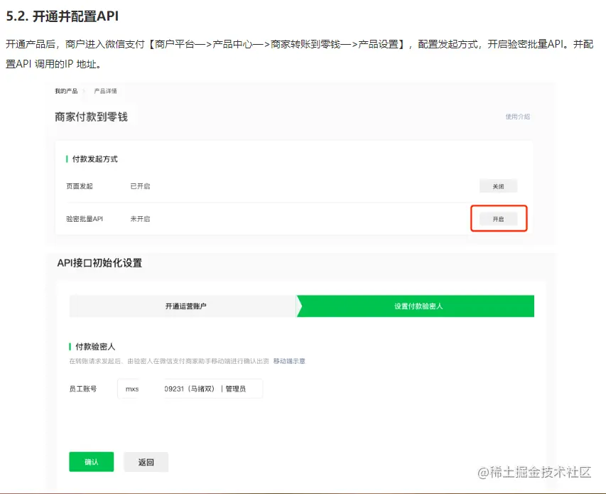 3、开通产品后,商户进入微信支付【商户平台—>产品中心—>商家转账到零钱—>产品设置】,配置发起方式,开启验密批量API。并配置API 调用的IP 地址。