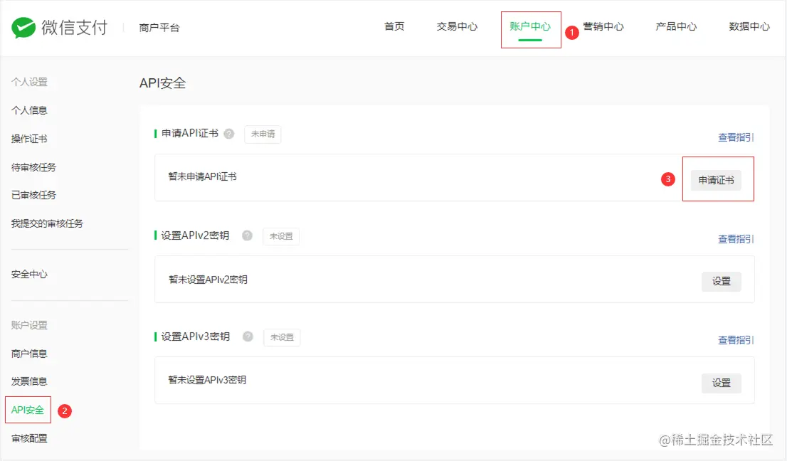 2、登录微信商户平台,进入【账户中心 > API安全 】目录,申请证书。