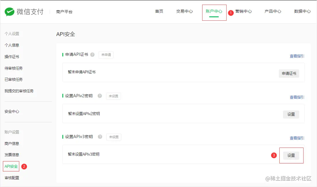 1、登录微信商户平台,进入【账户中心 > API安全 】目录,设置APIV3密钥。
