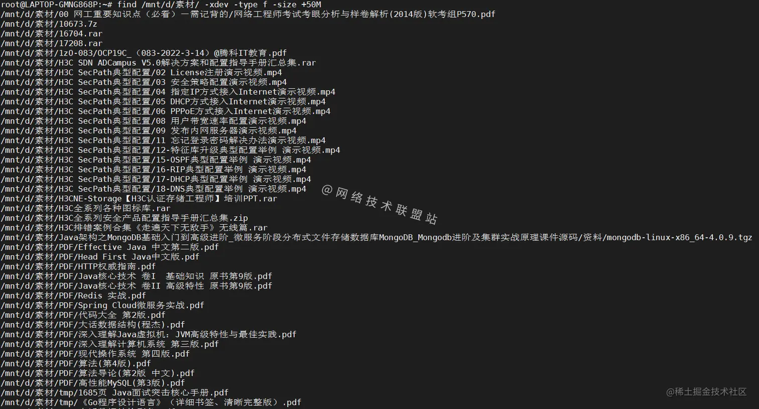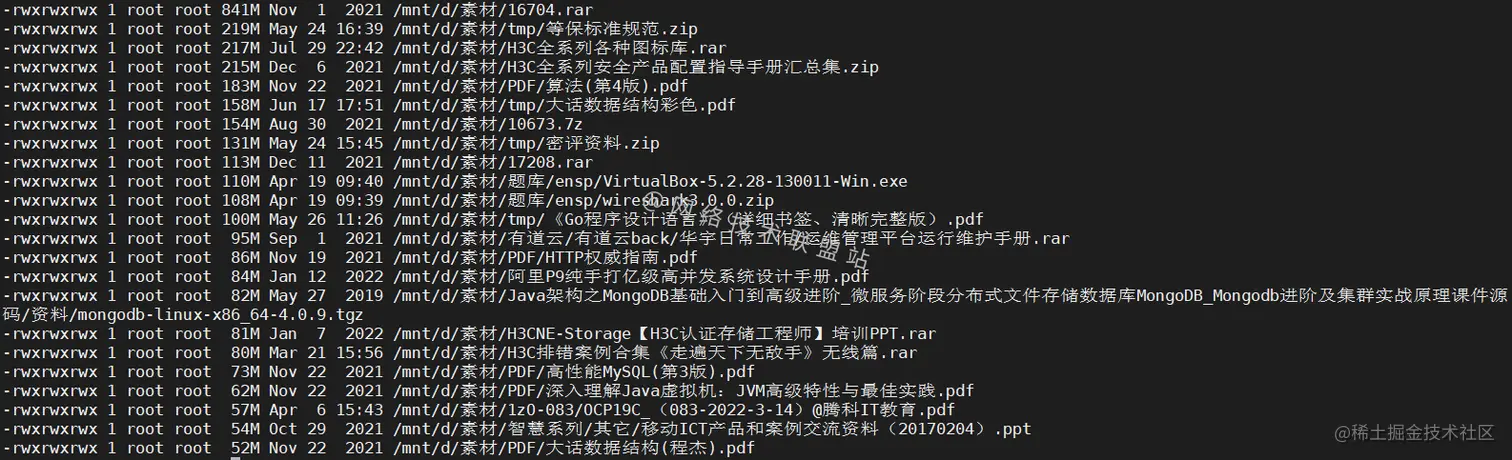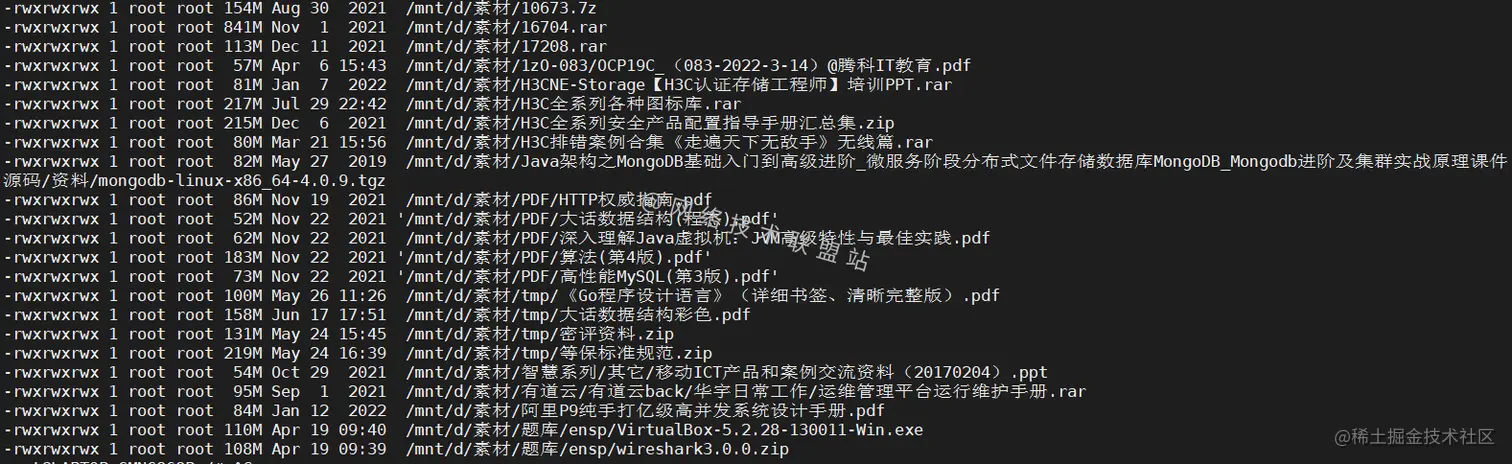 如图,目录/mnt/d/素材中都是各种书籍和资料,所以查出来的结果比较多。