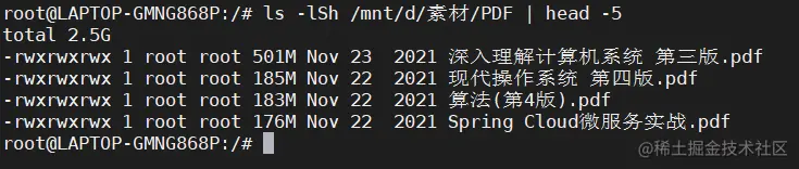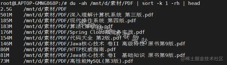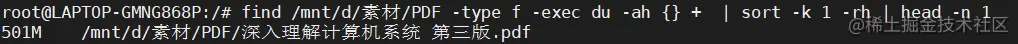 如果,我们看到结果中第一行是/mnt/d/素材/PDF目录的总大小,第二行501M /mnt/d/素材/PDF/深入理解计算机系统 第三版.pdf才是最大的那个文件。
