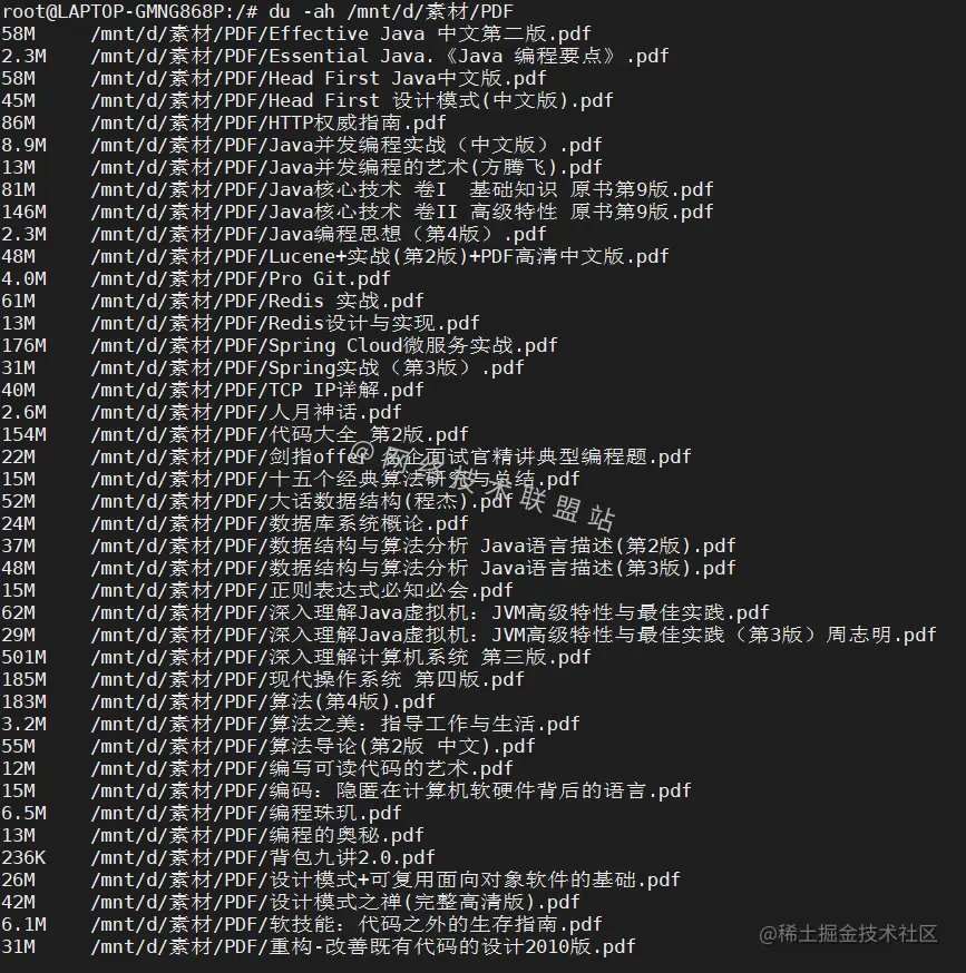 如图,目录/mnt/d/素材/PDF都是PDF书籍,du -ah命令中: