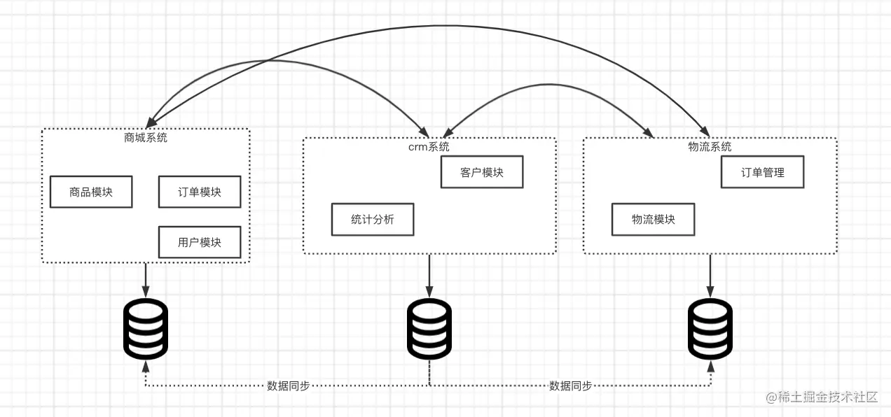 - 系统之间的接口多为实现数据同步,如上图中三个项目要同步客户信息。