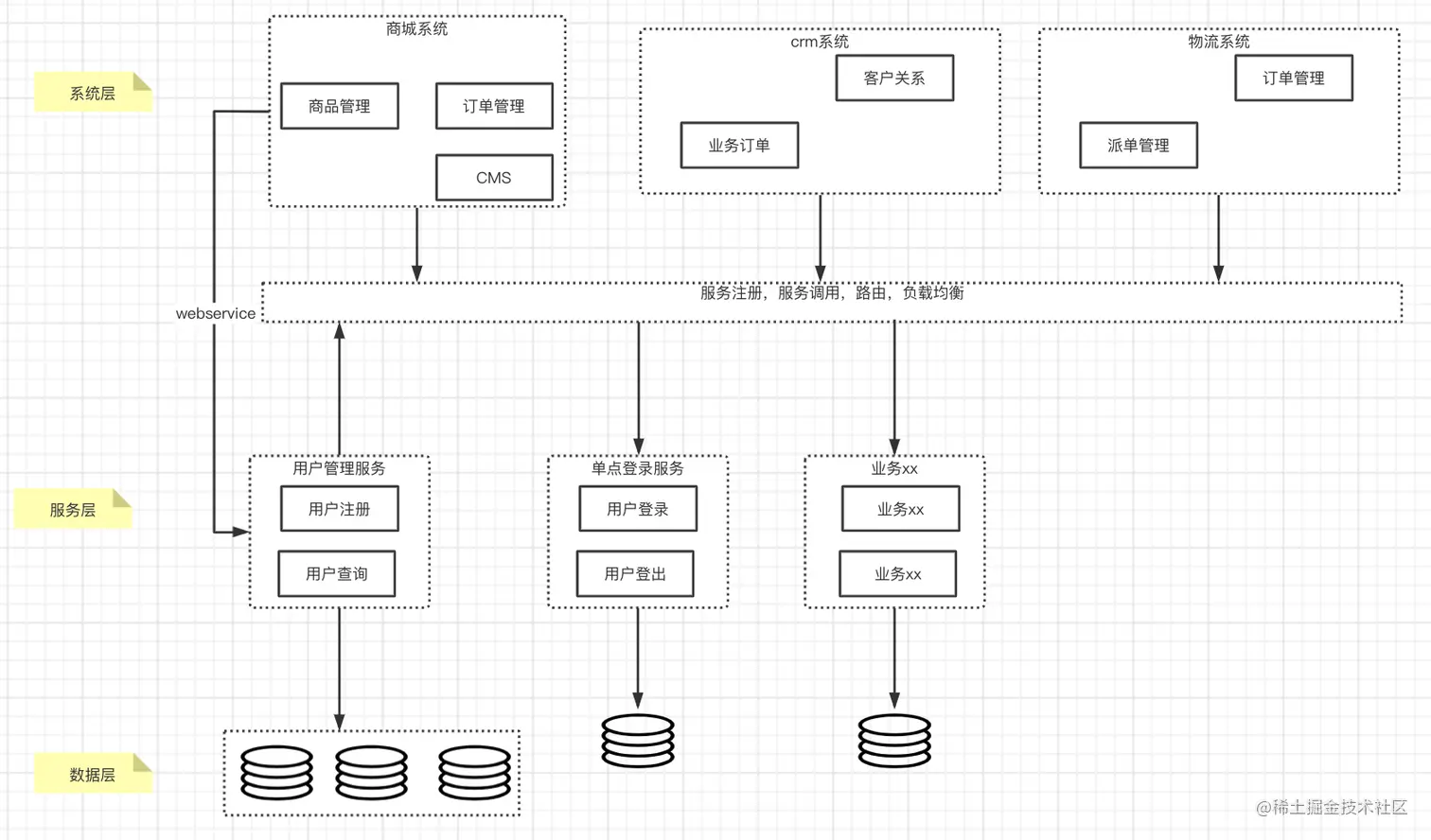 - 各系统与服务之间采用webservice、rpc等方式进行通信。