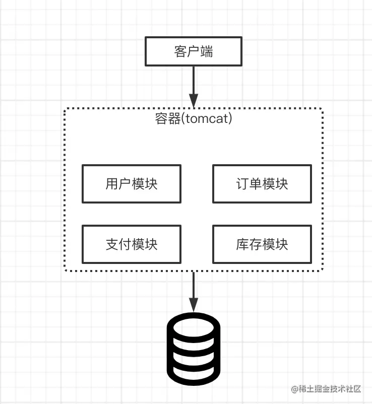 将所有的功能打包到一起并放在一个web容器中运行。所有的模块使用同一个数据库。