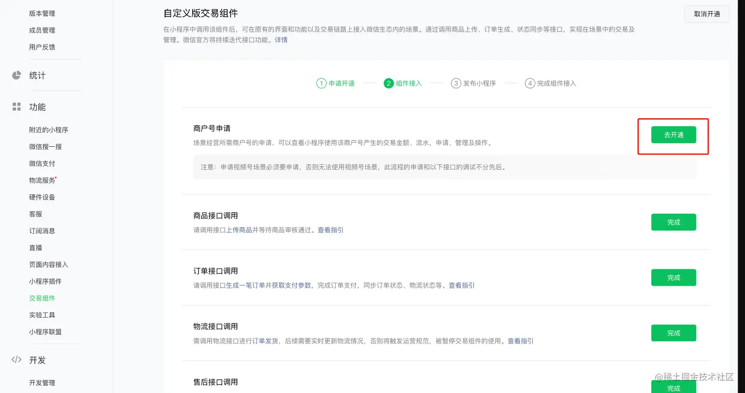 前往微信公众平台中,进入 “交易组件”>“场景接入” 菜单中,查看并选择需要接入的场景,微信官方默认所有场景均可接入。