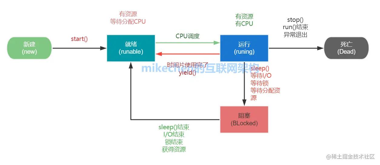 - 死亡状态:线程在run()方法执行结束后进入死亡状态。此外,如果线程执行了interrupt()或stop()方法,那么它也会以异常退出的方式进入死亡状态。