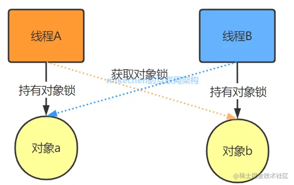 当线程互相持有对方所需要的资源时,会互相等待对方释放资源,如果线程都不主动释放所占有的资源,将产生死锁,如图所示: