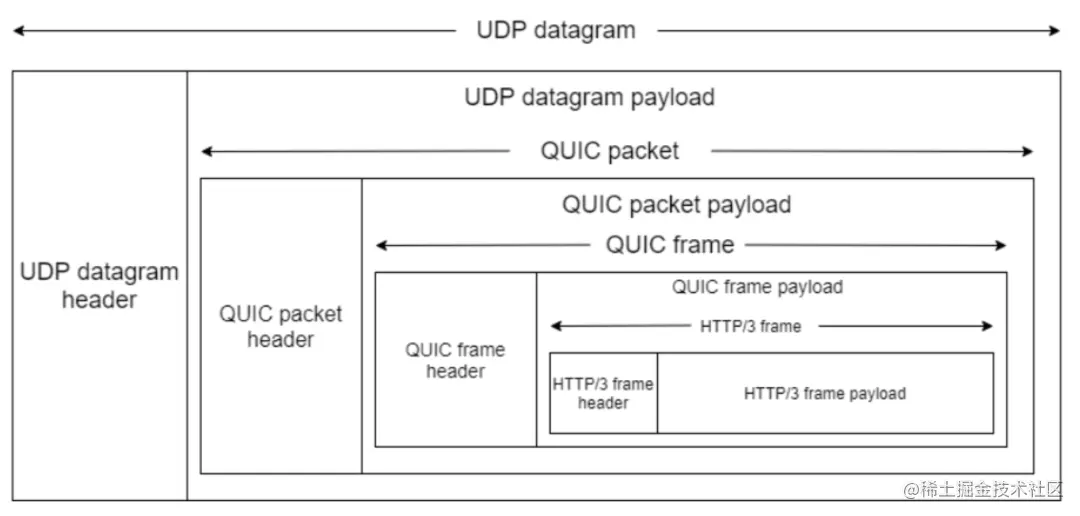 拿 HTTP/3 举例子,在 UDP 报文头部与 HTTP 消息之间,共有 3 层头部: