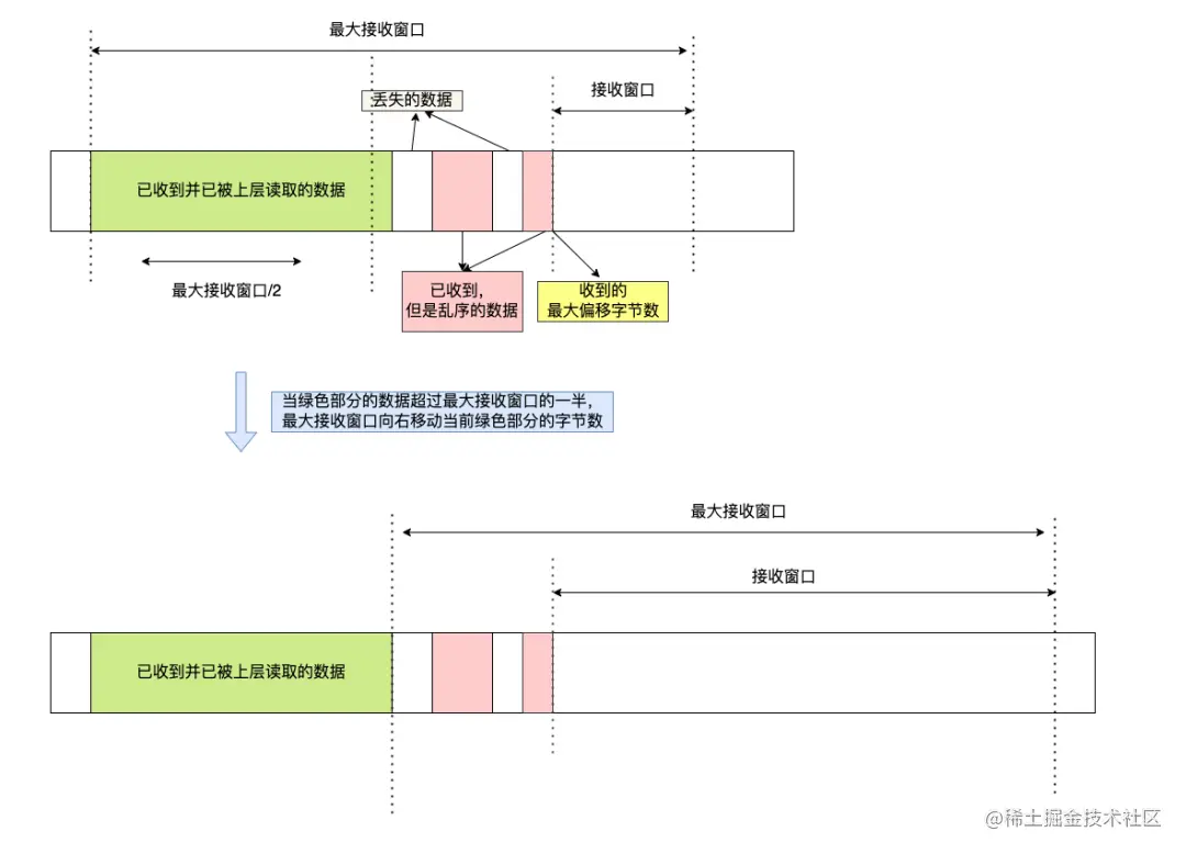 可以看到,接收窗口的左边界取决于接收到的最大偏移字节数,此时的接收窗口 = 最大窗口数 - 接收到的最大偏移数,这里就跟 TCP 不一样了。