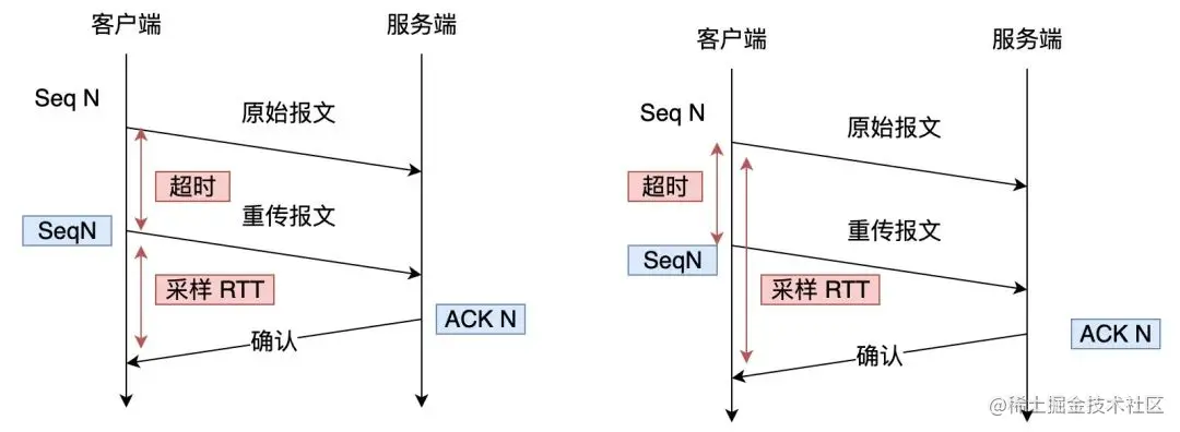 - 如果算成原始报文的响应,但实际上是重传报文的响应(上图右),会导致采样 RTT 变大;