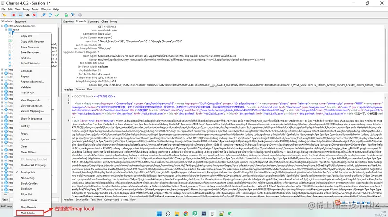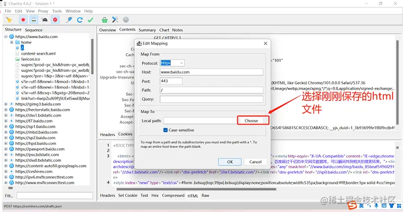 3.设置 Charles 进行 map local,右键点击 Map Local->进入 Edit Mapping ->点击 choose ->选择修改后的 html->点击 OK