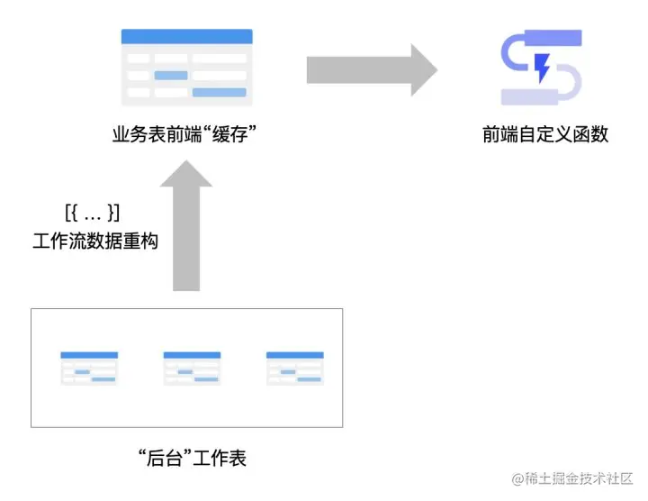 这个思路的核心是将工作表文本控件作为前端数据存储容器,通过自定义函数进行读取和前端逻辑处理。其中,数据本身还是来源于常规的工作表,但是可以通过工作流读取一个或多个表的数据,并重构出一个独立的前端数据源。这个数据可以直接存储在工作表中,作为前端自定义函数可访问的“数据缓存”。