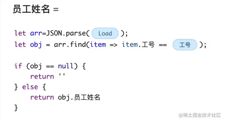3.在目标控件中设置自定义函数。通过加载对应的“缓存数据”,再结合自定义JS代码,即可实现自定义的判断和计算逻辑。如本示例中,根据输入的工号检索数组对象,并显示其中的字段值(可以根据输入实时刷新数据)。