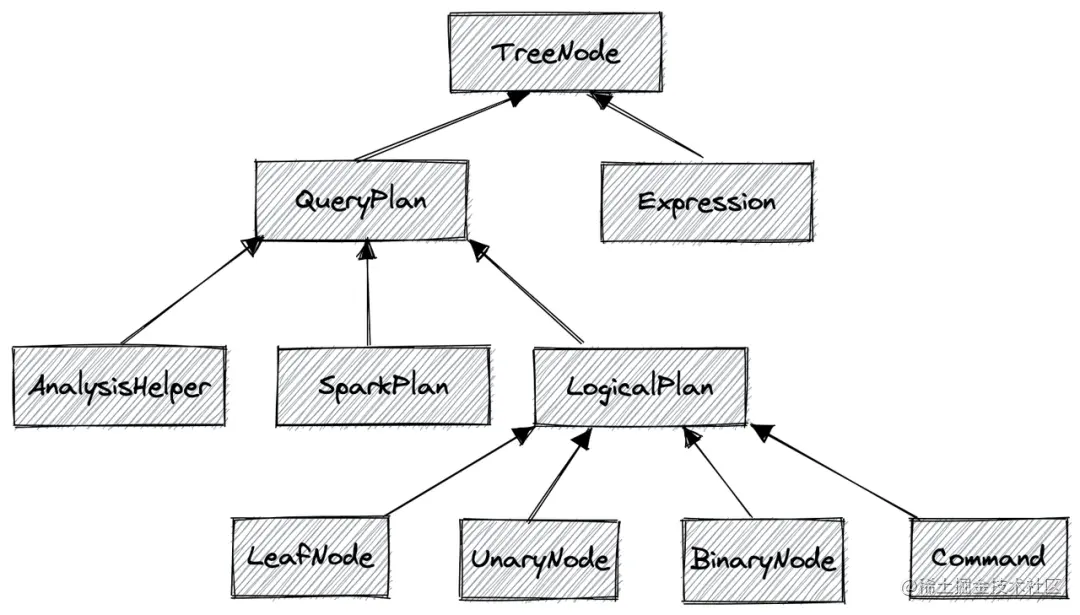 在这个过程中,Spark SQL 会被解析为一颗树。树的节点称为 TreeNode,它有多个实现类,可以用来表示逻辑计划树与物理计划树中各种类型的节点。这里不过多展开,我们只需要知道由 TreeNode 组成的一颗树可以表示一条 SQL:如过滤条件会被解析为 Filter 算子节点。