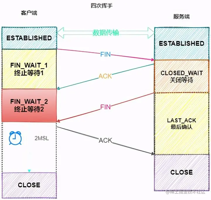 - 客户端在经过 2MSL 一段时间后,自动进入 CLOSED 状态,至此客户端也完成连接的关闭。