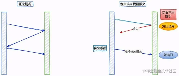 如果服务器端就直接创建了这个连接并返回包含 SYN、ACK 和 Seq 等内容的数据包给客户端,这个数据包因为网络传输的原因丢失了,丢失之后客户端就一直没有接收到服务器返回的数据包。