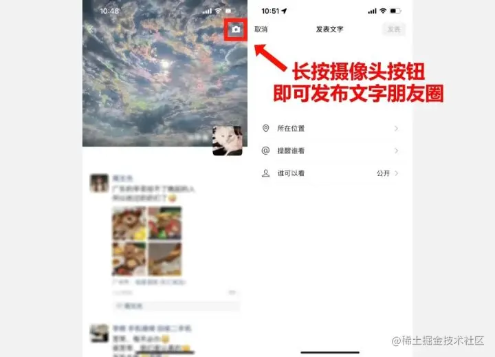 我们只需要打开 【朋友圈】,长按右上角摄像头形状的【发布朋友圈】按钮,就可以单独编辑文字朋友圈啦!
