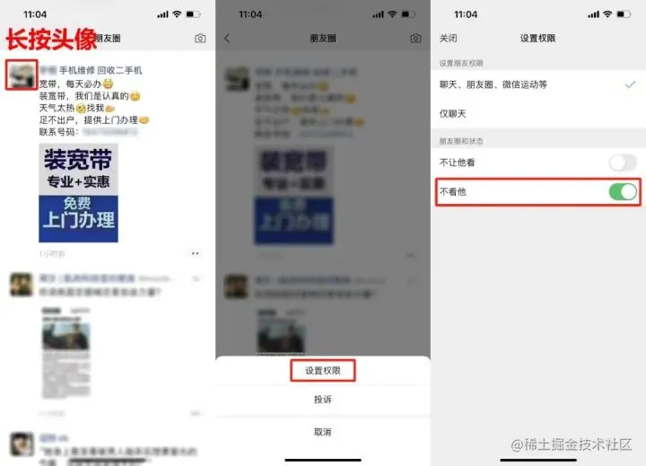 在朋友圈刷到时,我们就可以立马长按他的头像,点击【设置权限】,选择【不看他】快速将其屏蔽,在朋友圈永不相见!