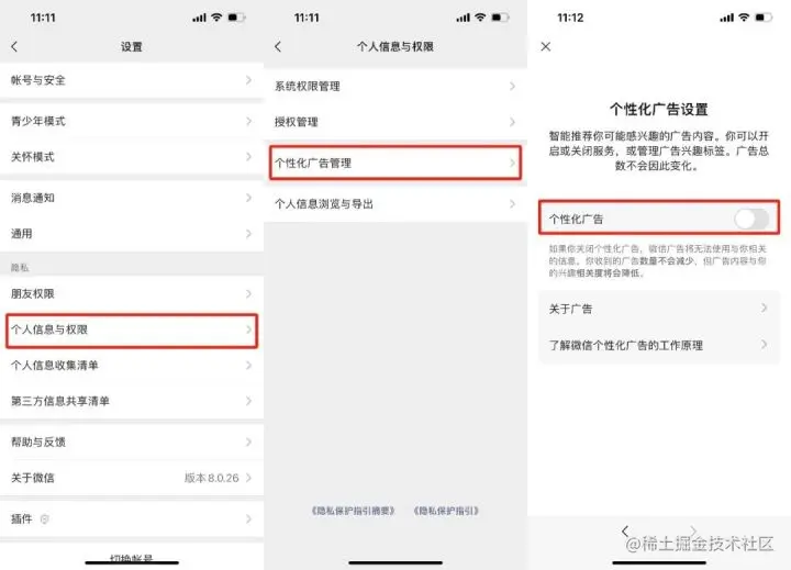 如何关闭朋友圈个性化广告呢?我们可以在【设置】——【个人信息与权限】——【个性化广告管理】中将个性化广告给关闭,这样今后就再也看不到它啦!