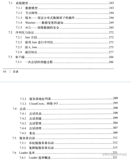 第四部分(第7章)对ZooKeeper的架构设计和实现原理进行了深入分析,包含系统模型、Leader 选举、客户端与服务端的工作原理、请求处理,以及服务器角色的工作流程和数据存储等: