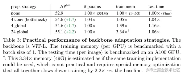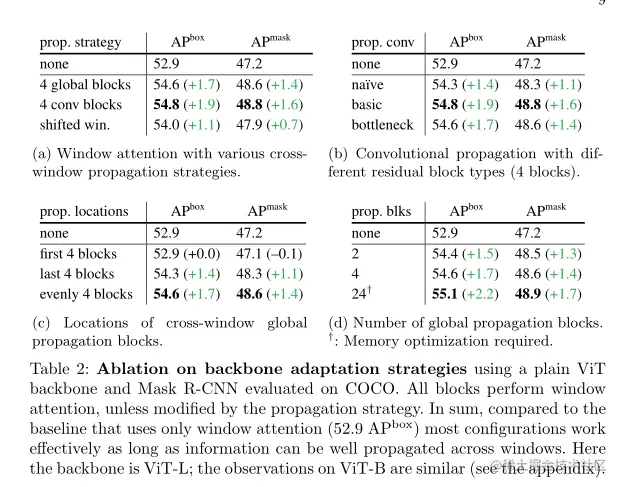 上表消融了本文的骨干适应方法。简而言之,在具有纯窗口注意力且没有跨窗口传播块的基线之上,各种传播方式都可以显示出不错的收益。
