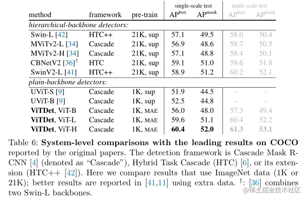 上表展示了与原始论文报告的 COCO SOTA结果的系统级比较。