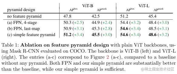作者将与同样构建在普通主干上的两个 FPN 变体进行比较(上图)。在第一个变体中,主干被人为地分为多个阶段,以模仿分层主干的阶段,应用横向和自上而下的连接(上图 (a))。第二个变体与第一个变体类似,但仅使用最后一个映射而不是划分的阶段(上图 (b))。