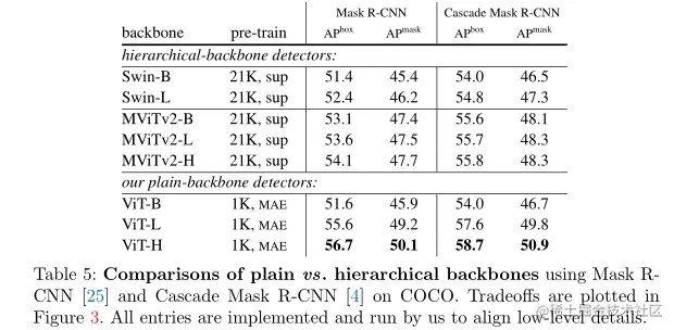 本文的骨干适应很简单,并且使检测微调与全局自注意力预训练兼容。如前所述,没有必要重新设计预训练架构。