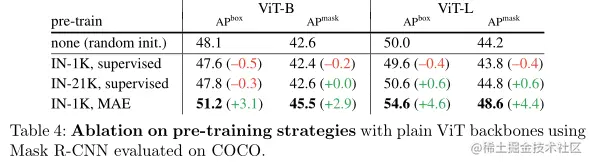 上表展示了使用在 COCO 上评估的 Mask R-CNN 对具有普通 ViT 主干的预训练策略进行消融。