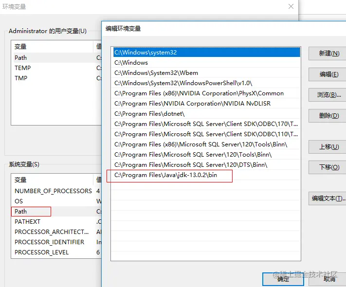 为了一劳永逸,我们在系统通用的环境变量里配置,找到Path环境变量,点击编辑,在新界面添加Jdk地址C:\Program Files\Java\jdk-13.0.2\加上bin,如下图: