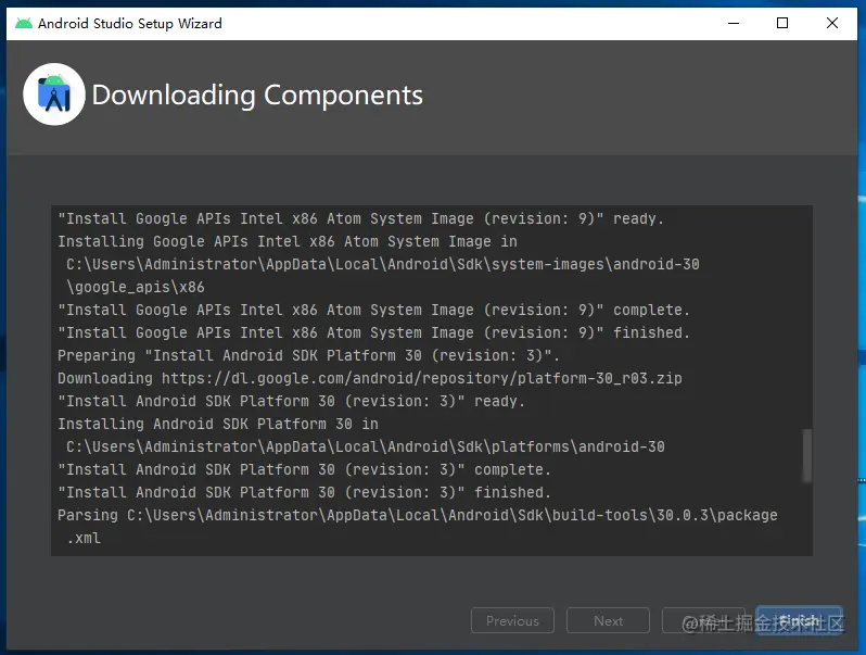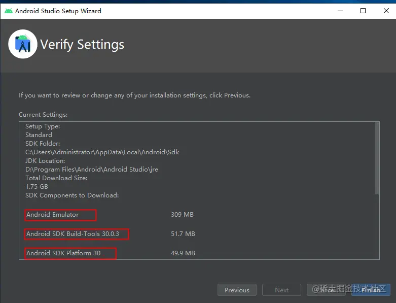 然后进入安装内容介绍页面,页面提示我们会安装一些Android工具,比如Android Emulator一款非常好用虚拟机。然后我们点击Finish。