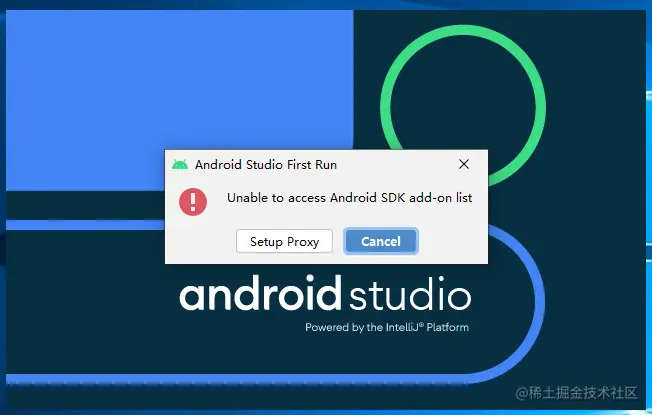 然后弹出Andriod Studio Sdk缺失提示,因为我们没有代理,所以我们选择取消,如下图: