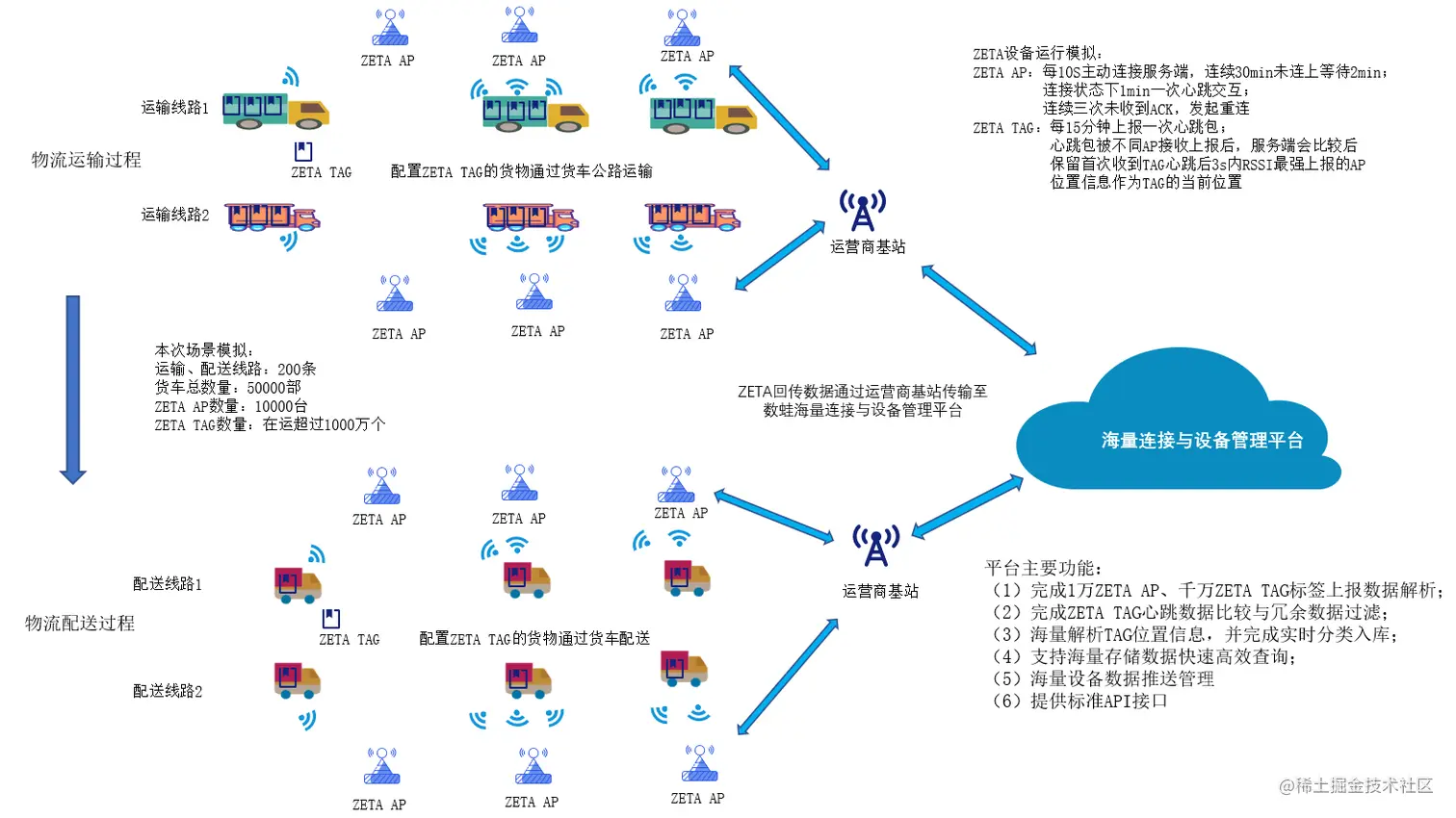 本次压力测试通过模拟1万ZETA AP、千万ZETA TAG标签的在线运行,精准高效完成ZETA AP、ZETA TAG的在线协议解析、解析数据实时入库、海量数据在线查询与展示等流程。同时,对真实物流业务场景进行抽象,实现批次ZETA TAG在不同线路上发生轨迹改变,移动过程中利用不同的ZETA AP实现定位。ZETA TAG在线运行过程中,每隔15分钟发送心跳包,被临近的单个或者多个ZETA AP报送至服务端。服务端会按照策略选择信号最好的上报数进行存库,并利用上报信号最好的AP对ZETA TAG进行定位。