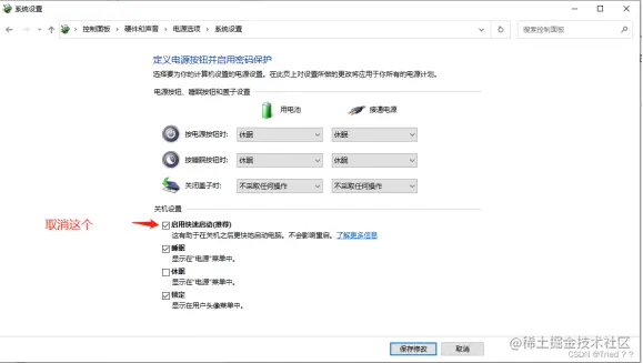 - 出来这个界面,就更改当前不可用的设置,专门修改箭头指向的启用快速启动。