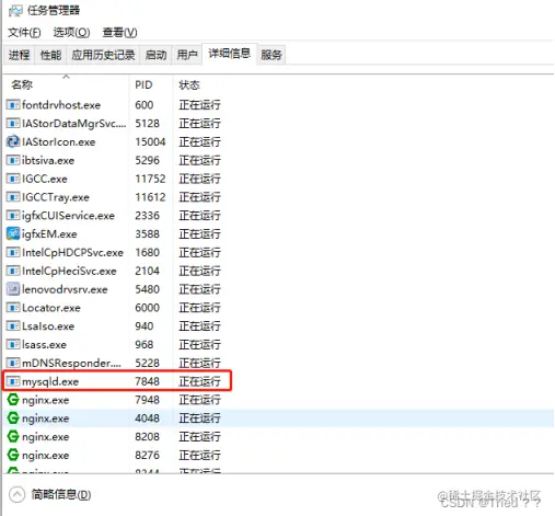 - 打开任务管理器点击详细信息,查找 PID 为 7848 的服务,我这是被本地 mysql 占用了,关闭 mysql 就行,也可以更换端口号