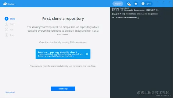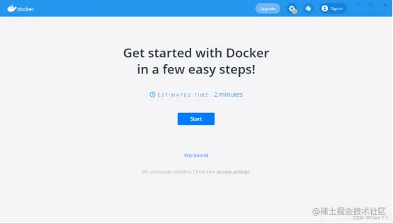点击左下角 Skip tutorial 就可以跳过教程 进入 docker,
